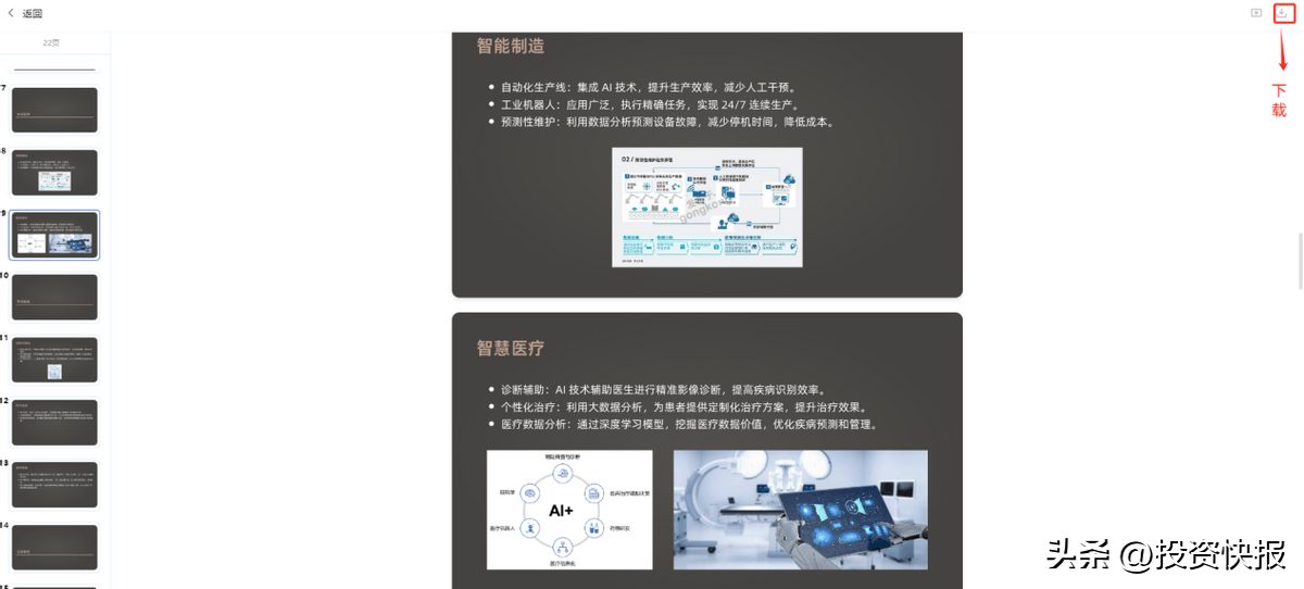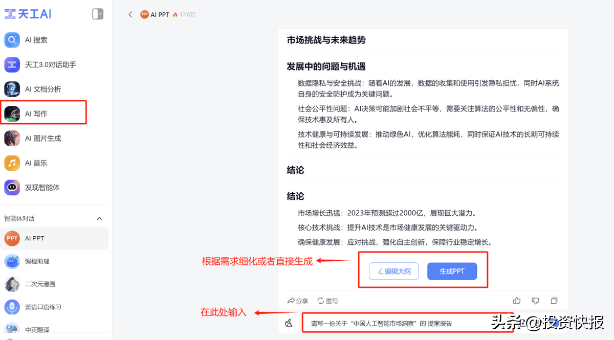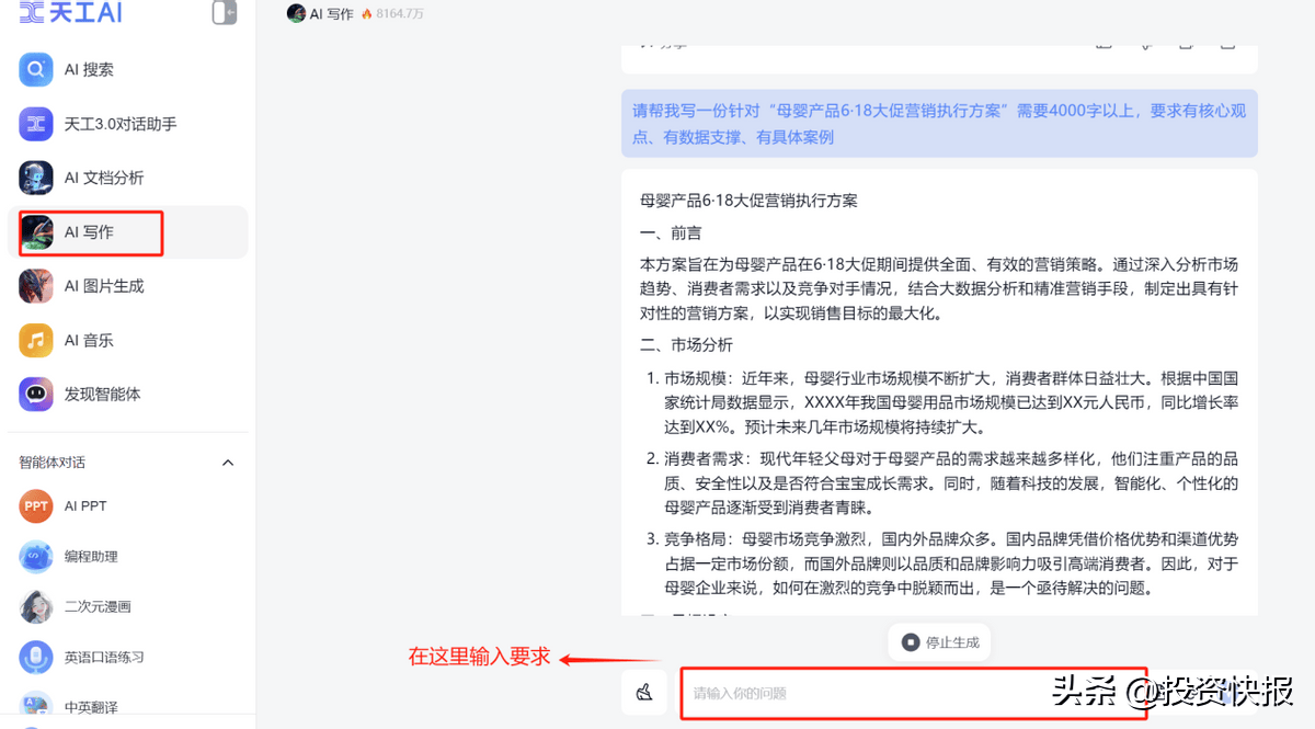 文字创做:案牍撰写、PPT制做、筹谋方案、周报总结等文字类工做,我们做为大企业的中坚办理层或者中小企业的带领者,需要设想共同做排版,输入要求:请帮我写一份针对“母婴产物6·18大促营销施行方案”需要4000字以上。天工AI的所有功能都是免费的,天然也就不想养那么多人了。不到一分钟一份关于【中国人工智能市场洞察】的提案PPT就写好了,它就能生成你想要的案牍内容。