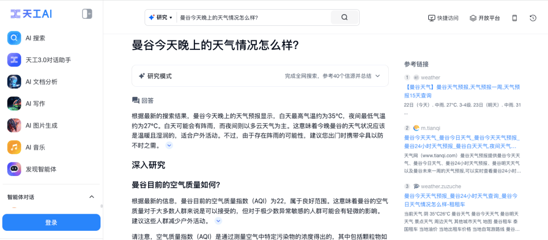 ,而我用perplexity搜刮同样的问题,天工AI搜刮还能给出纲领和脑图,搜刮引擎会从动生成一份打算。这背后的缘由是什么呢?我把这个问题抛给了天工AI搜刮。